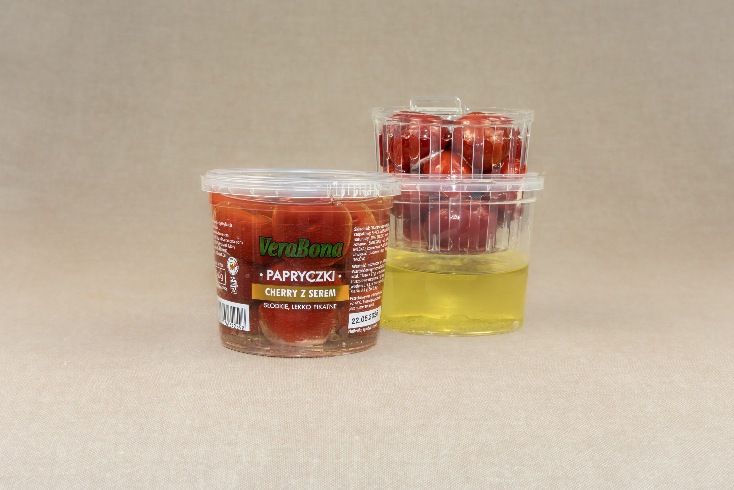 Papryczki cherry z serem śmietankowym w oleju w wygodnym kubeczku z koszyczkiem.